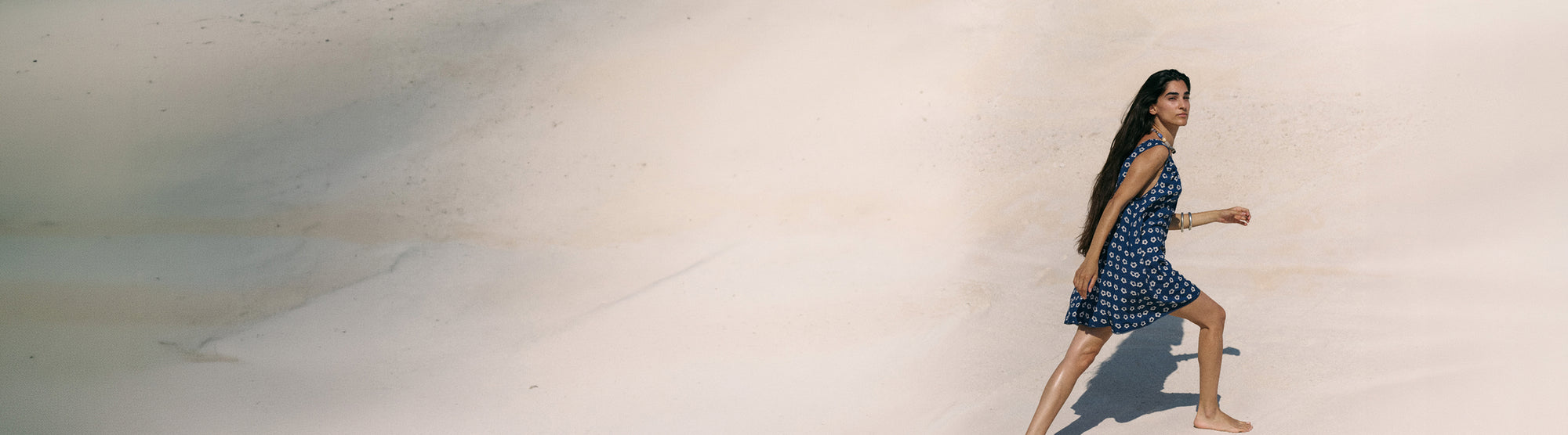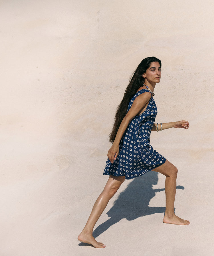 Sundress Mini Indigo — hand block print indigo mini dress with daisy print on sandy beach | Daughters of India Sundress Mini Indigo — neckline keyhole detail, hand block print indigo linen viscose mini dress | Daughters of India